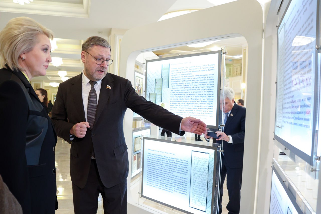 Подобная выставка впервые проводится в Совете Федерации, а подлинники документов — типографский печатный экземпляр Соборного уложения 1649 года и Приговорная грамота Земского собора 1651 года — ранее нигде не экспонировались, отметил сенатор.