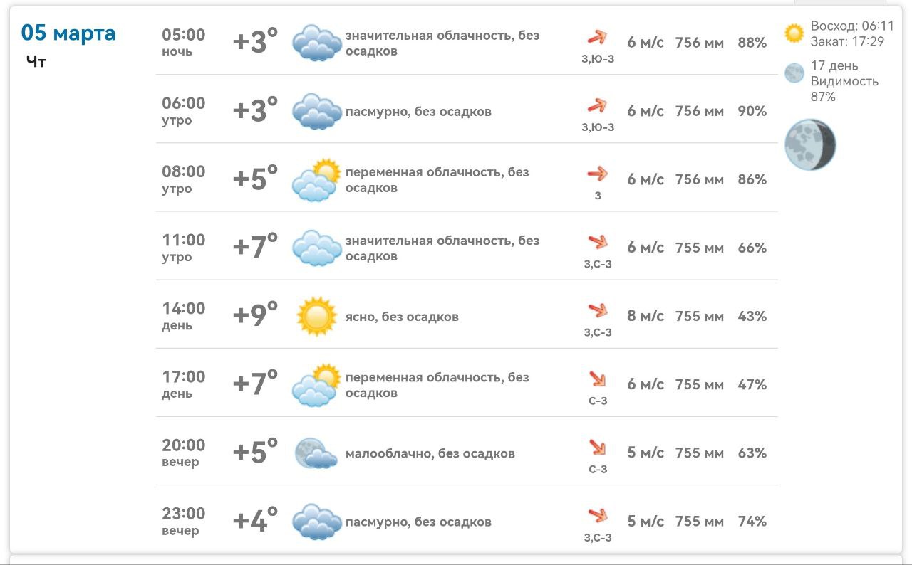 Прекрасного дня и замечательного самочувствия!Подробно о погоде в Днепрорудном 5 марта 2026 годаНародные приметы 5 мартаЕсли грачи и галки вьются высоко стаями и опускаются стрелой на землю – ждите снега.Галки и сороки в снегу купаются – к...