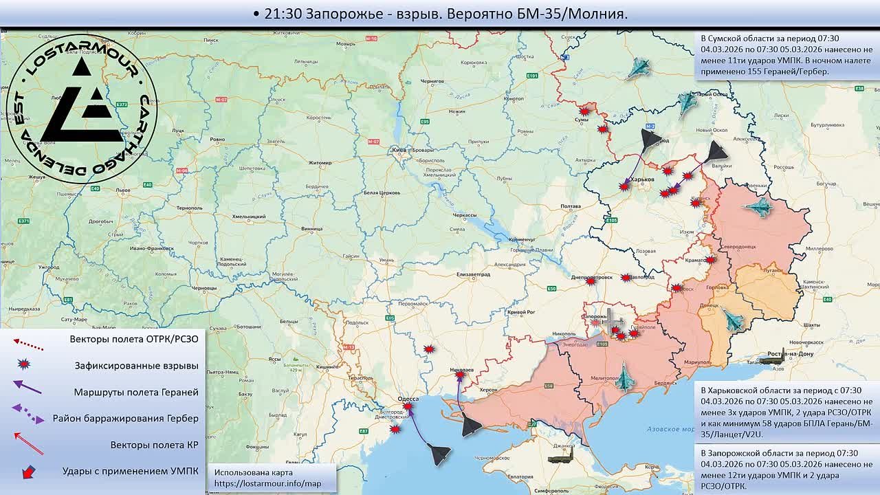 Анимированная схема ударов по территории Украины 04 марта 2026 – 05 марта 2026 года.