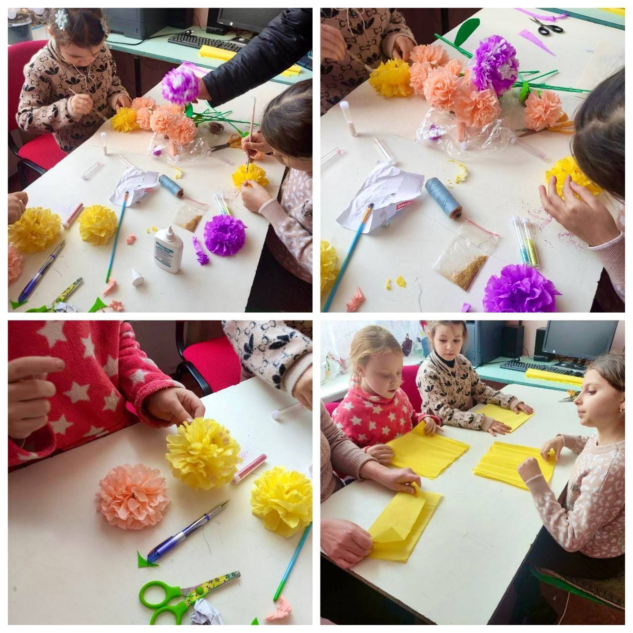 В библиотеке села Трояны прошла творческая мастерская «Цветы одним жестом». Мероприятие было организовано с целью познакомить детей с историей праздника 8 Марта и дать им возможность создать душевный подарок для мам и бабушек своими руками.