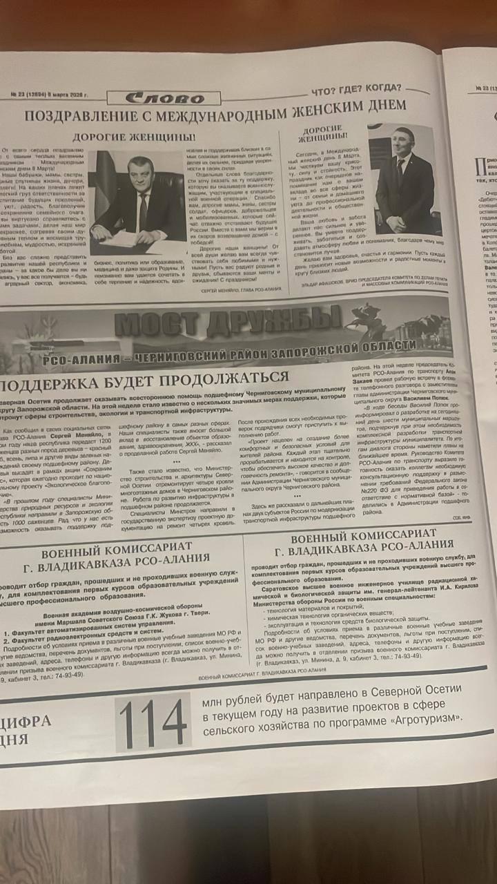 Газета Северной Осетии «Слово» продолжает рассказывать о жизни Черниговского района Запорожской области. С начала года в издании выходит специальная рубрика, посвящённая сотрудничеству двух регионов.