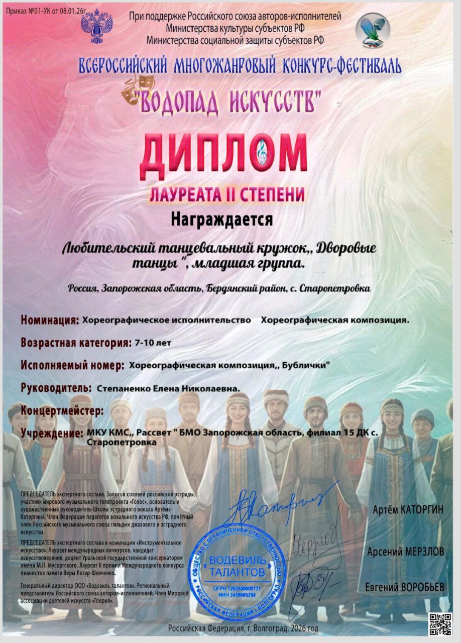 Воспитанники любительского танцевального кружка «Дворовые танцы» Старопетровского ДК приняли участие в III Всероссийском многожанровом фестивале «Водопад искусств» и добились заметных успехов. Младшая группа коллектива завоевала звание лауреата II степени с хореографической композицией «Бублики», а старшая группа получила звание лауреата III степени за исполнение композиции «Месяц май».