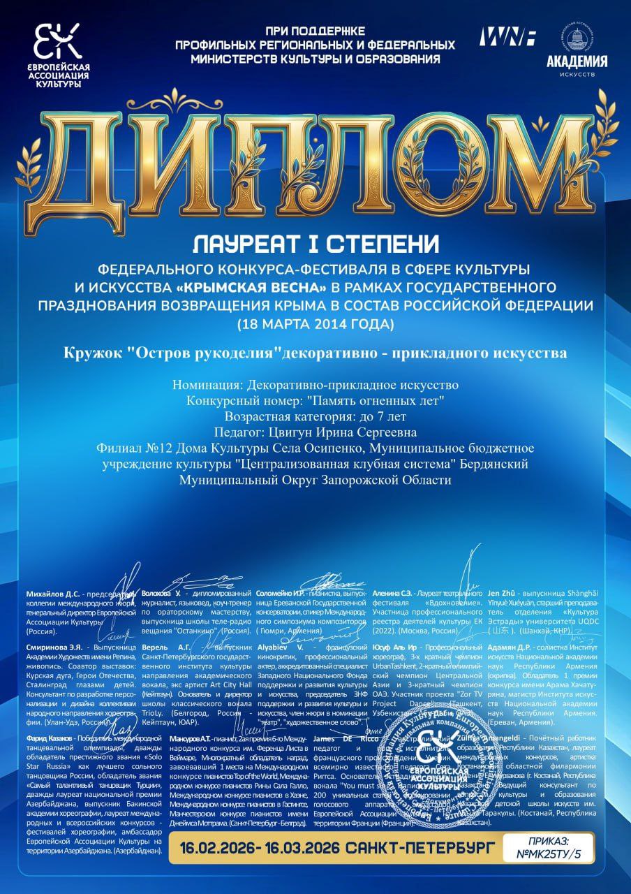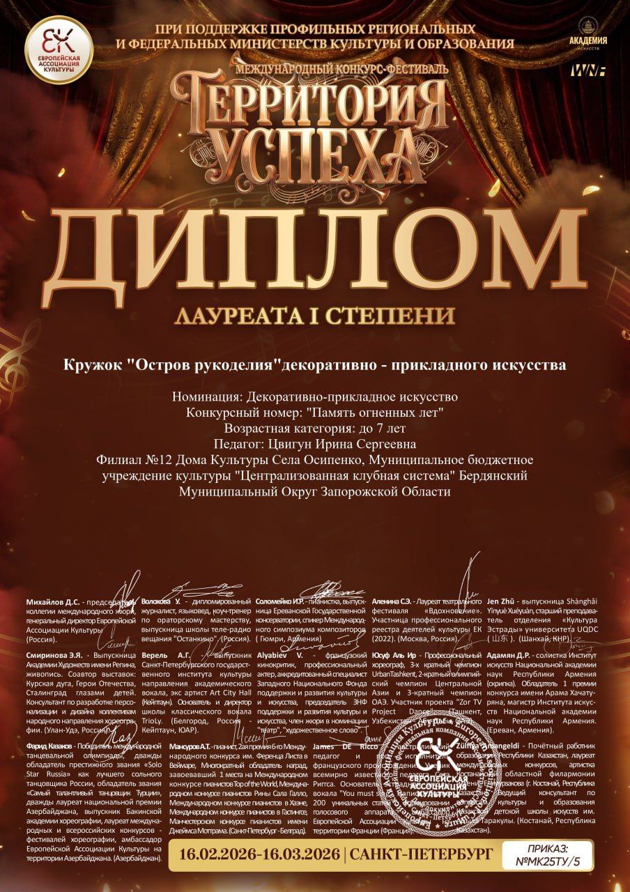 Кружок декоративноприкладного искусства «Остров рукоделия» Дома культуры села Осипенко добился успехов на престижных творческих состязаниях. В этом году коллектив стал победителем Международного конкурсафестиваля «Территория Успеха» (проводится раз в три года) с конкурсным номером «Память огненных лет» в номинации декоративноприкладного искусства.