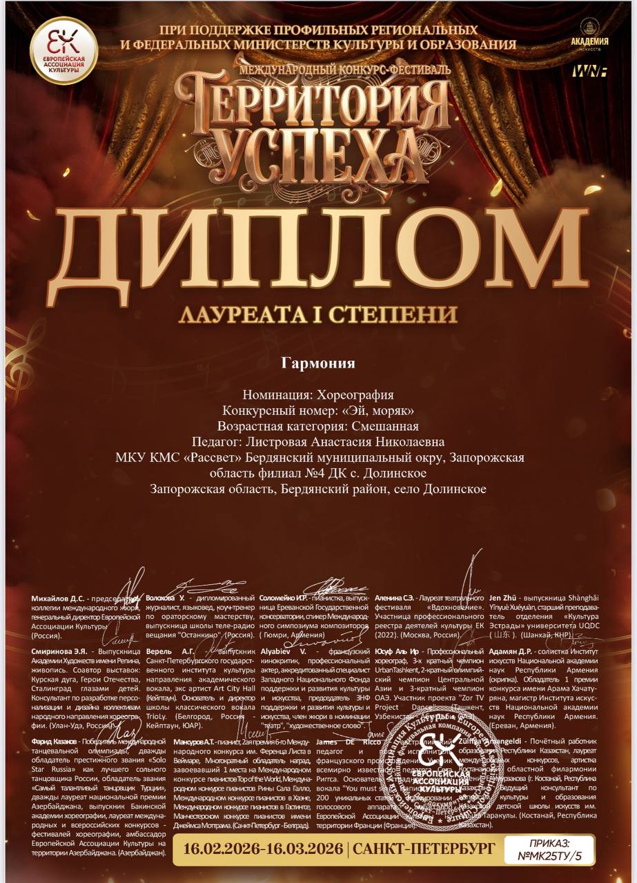 Дом культуры села Долинское продемонстрировал высокий уровень творческого мастерства на международном конкурсефестивале «Территория успеха», завоевав сразу три диплома лауреата I степени.