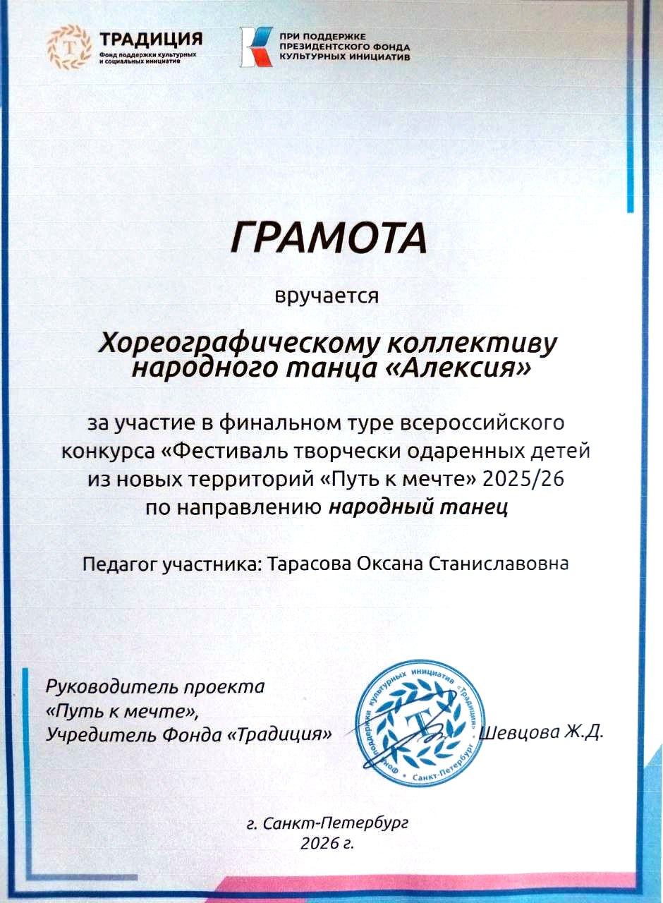 Воспитанники старшей группы танцевального коллектива «Алексия» (руководитель О.С. Тарасова) отдела «Детского творчества» МКУ ДО «Центр Олимп» достойно представили Михайловский муниципальный округ на престижном творческом состязании. Ребята приняли участие во Всероссийском фестивале творчески одаренных детей из новых территорий «Путь к мечте», который проходил при поддержке Президентского Фонда культурных инициатив.