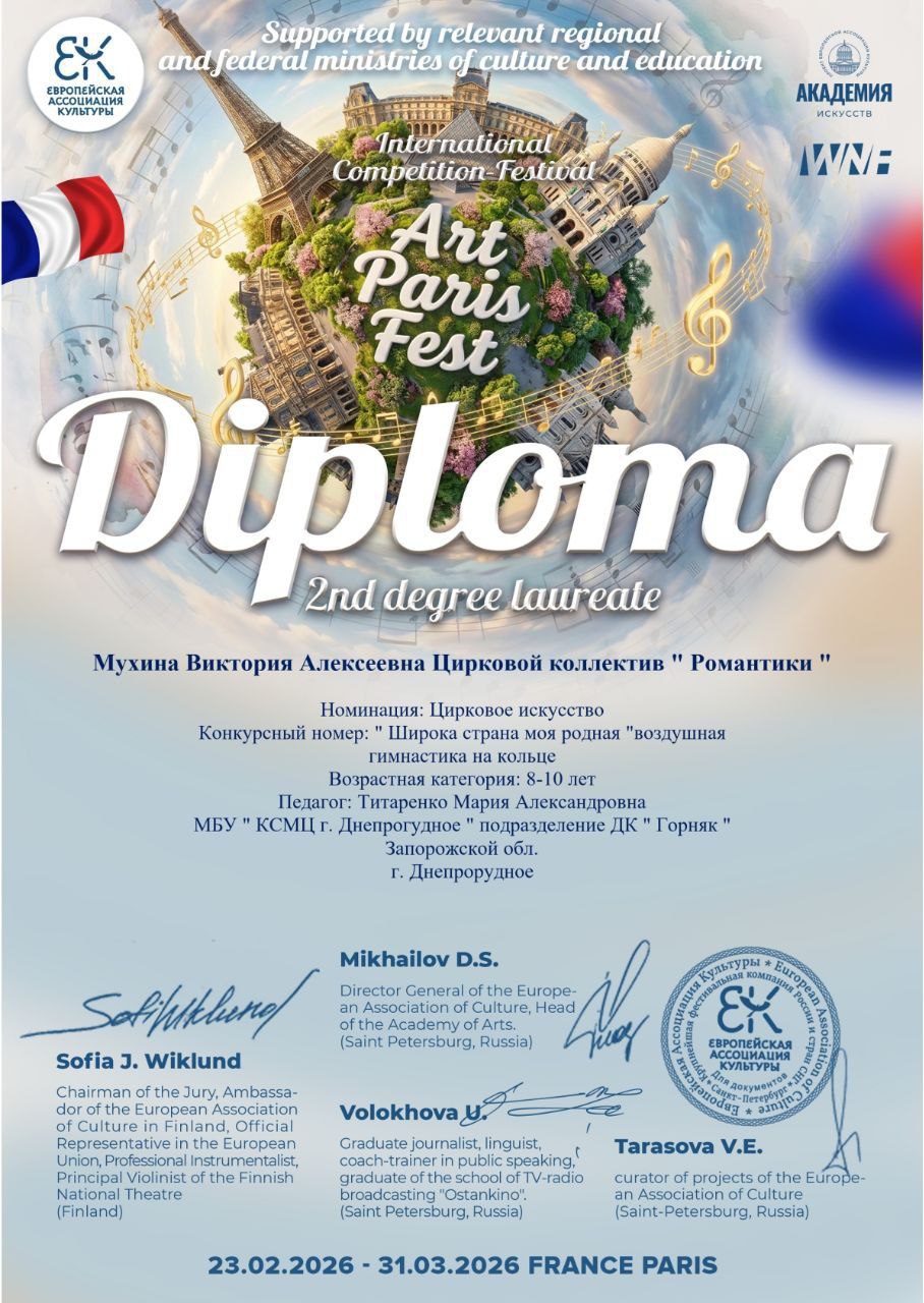 Поздравляем цирковой коллектив "Романтики" Дворца Культуры "Горняк" с блестящей победой на Международном конкурсе-фестивале "Арт Париж-фест"!