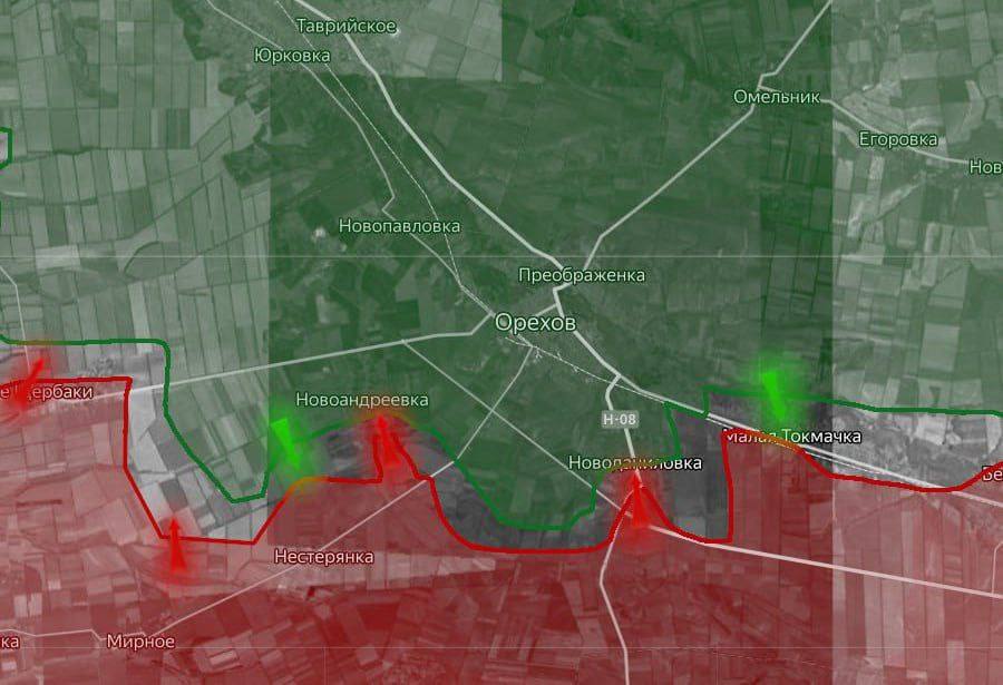 «На Запорожском направлении, в районе Щербаков, российские подразделения продвигаются в сторону Орехова.В районе Новоандреевки продолжаются воздушные столкновения.В Преображенке ВКС РФ нанесли удар по переправе, используемой ВСУ».Вражеские сводки