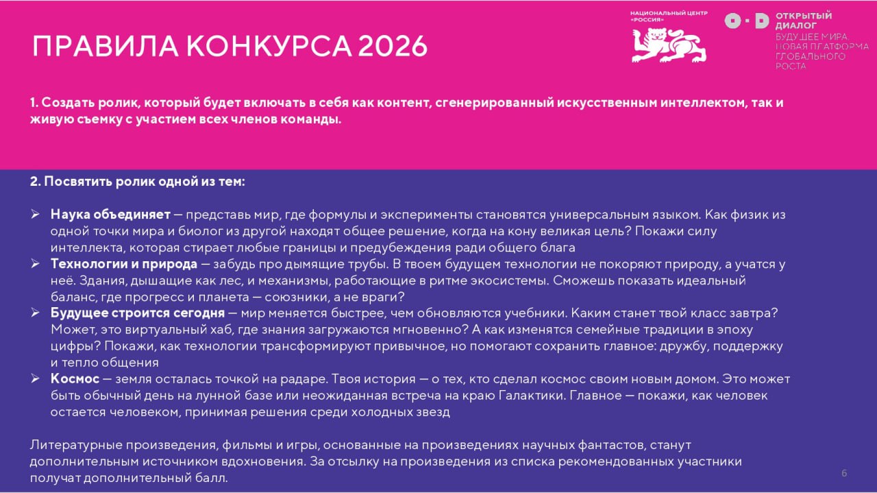 Участники создают видеоролик на темы технологий и космоса. В видео нужно проявить фантазию, использовать элементы живой съемки с участием команды и показать умение работать с искусственным интеллектом. Ролик нужно опубликовать в ВКонтакте и загрузить ссылку в личном кабинете на сайте конкурса: https://dream.russia.ru/