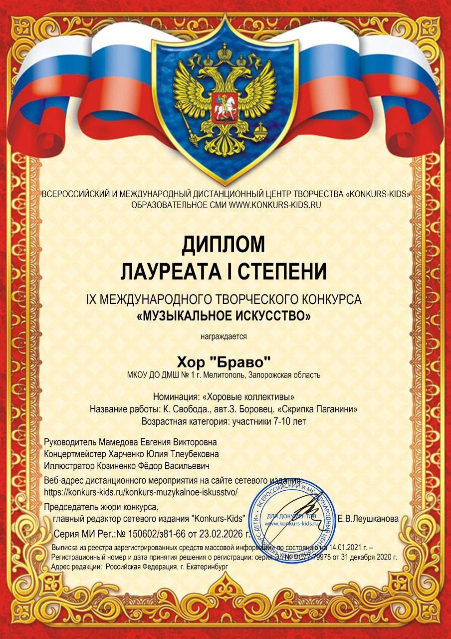 Поздравляем хор «Браво» и его руководителей с получением Диплома Лауреата I степени на IX Международном творческом конкурсе «Музыкальное искусство» (номинация «Хоровые коллективы»).