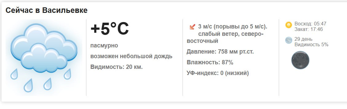 Сегодня, 17 марта 2026 года в Васильевке пасмурно, возможен небольшой дождь. Температура воздуха ... +5°С. Ветер: слабый, северо-восточный, до 5 м/с. Атмосферное давление: 758 мм.рт.ст. Влажность воздуха: 87%. УФ-индекс: 0 (низкий). Видимость на дорогах: 20 км.