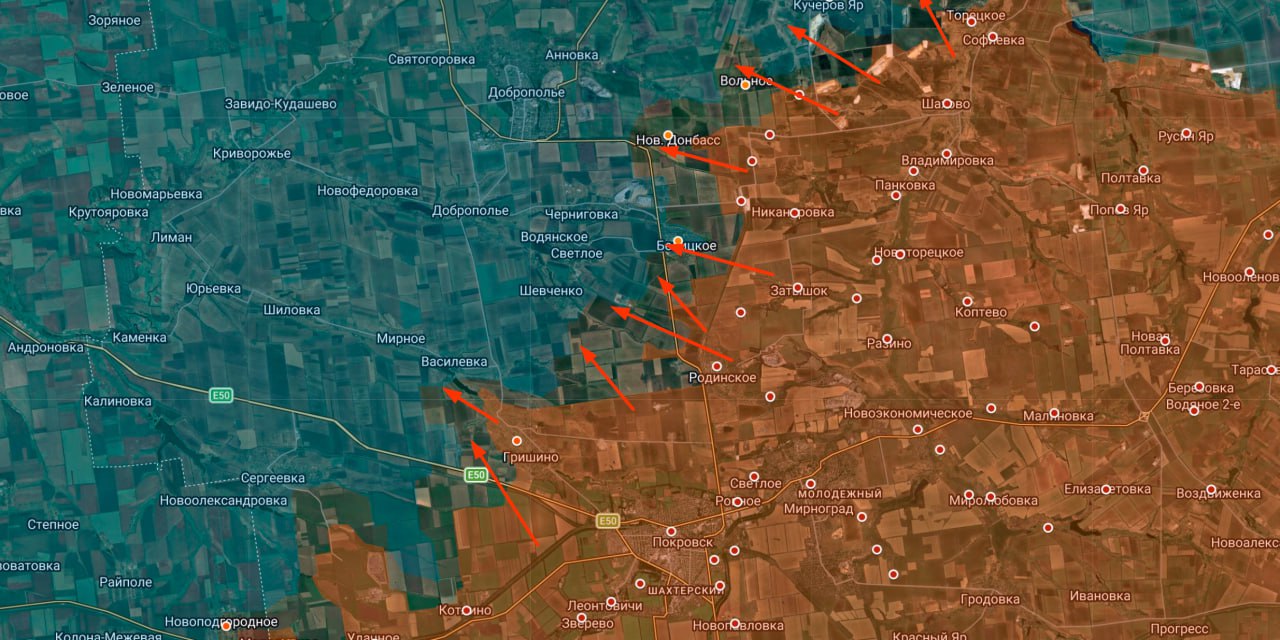 Севернее Покровска российские подразделения продвигаются через лесополосы, закрепляясь в рельефе — в частности, в оврагах восточнее Гришина. Эти позиции уже используются как опорные для дальнейшего вклинивания в сторону восточной окраины Новоолександровки.