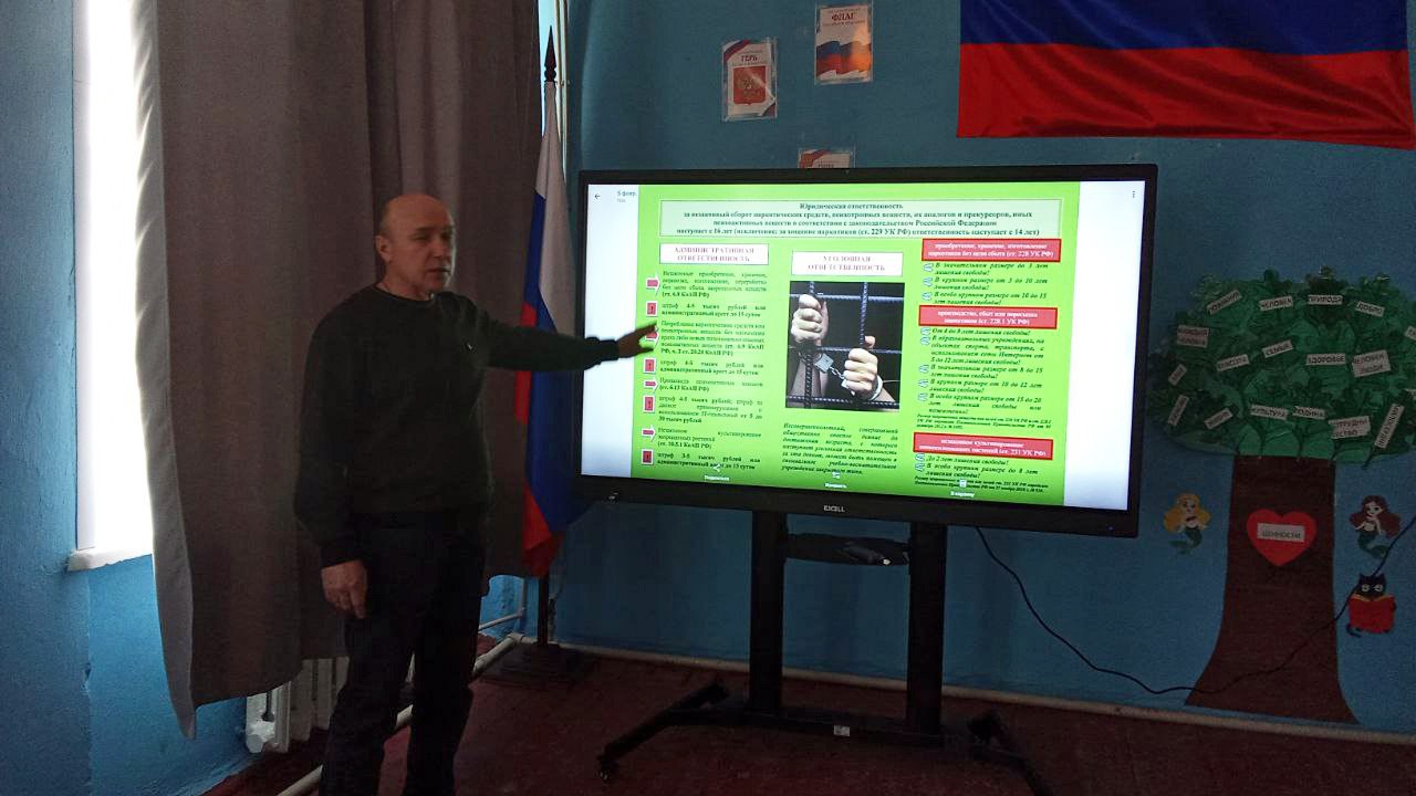 Также было уделено внимание теме вовлечения несовершеннолетних в противоправную деятельность. Специалист предостерег школьников, пояснив, что люди с наркотической зависимостью становятся легкой добычей для преступников, так как ими легко манипулировать. Он разъяснил ученикам меры административной и уголовной ответственности за преступления, связанные с наркотиками.