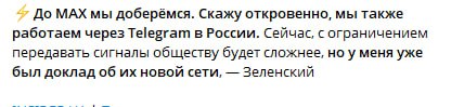, - ЗеленскийВ своей речи Зеленая сопля дал понять, что украинские структуры постараются внедриться в Мах:«Скажу откровенно, мы также работаем через Telegram в России. Сейчас, с ограничением Telegram в России, безусловно, передавать сигналы обществу...