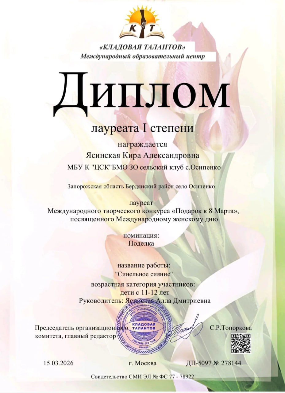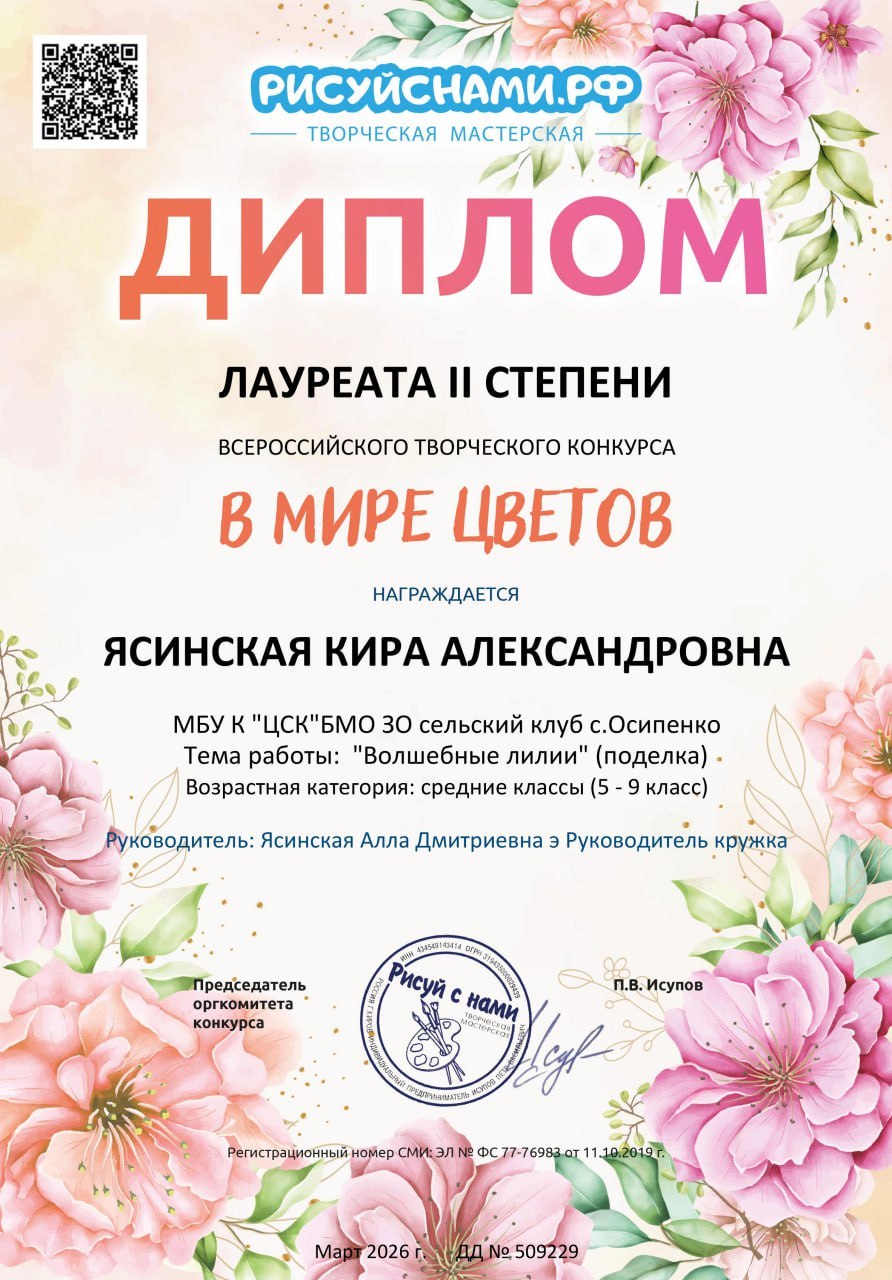 Ясинская Кира получила диплом лауреата 2-й степени на конкурсе «В мире цветов» с работой «Волшебные лилии», а также стала лауреатом 1-й степени на международном конкурсе «Подарок к 8 Марта» с картиной «Синельное сияние».