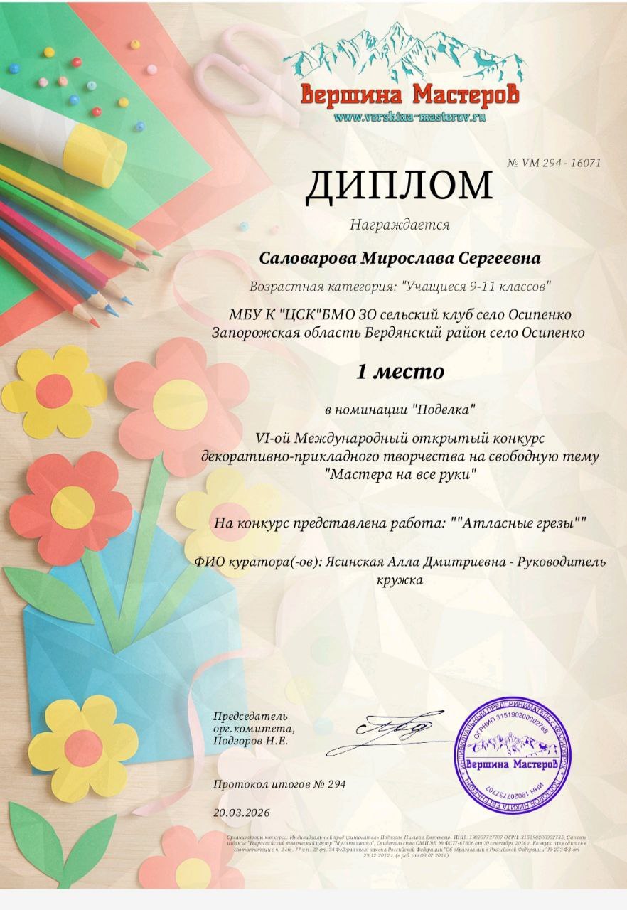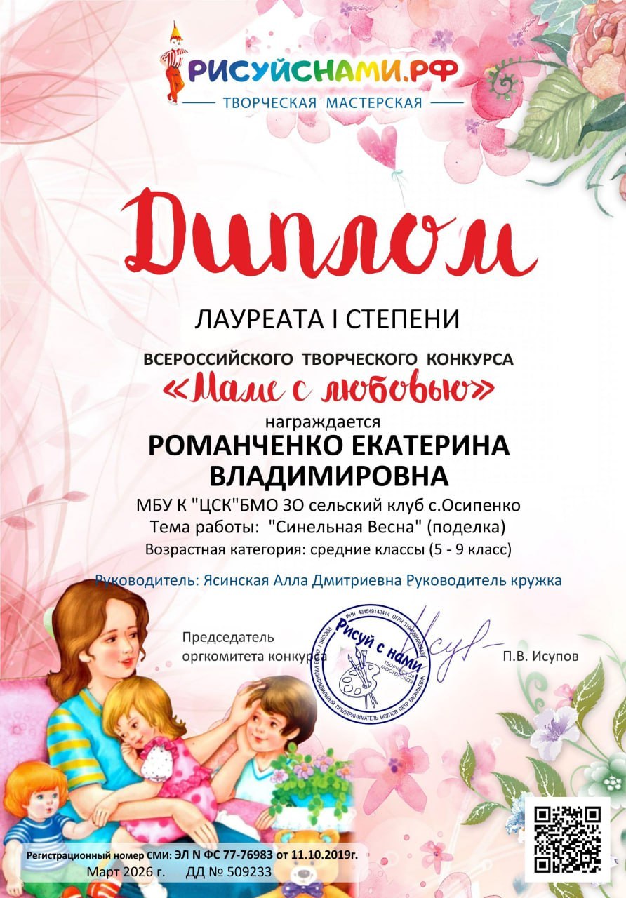 Ещё одна участница из села Осипенко, Романченко Екатерина, удостоена двух наград: диплома лауреата 1-й степени на всероссийском конкурсе «Маме с любовью» за работу «Синельное сияние» и аналогичного диплома на международном конкурсе «Подарок к 8 Марта» за композицию «Букет для мамы».