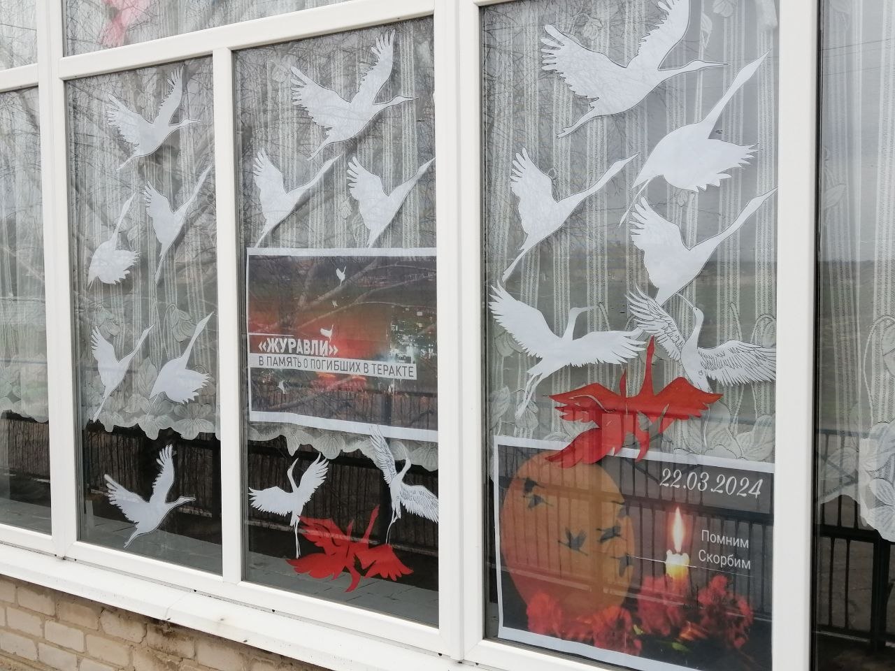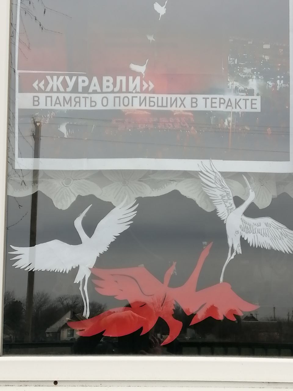 Окна учреждения были оформлены тематической инсталляцией «Журавли памяти». Белые птицы, устремлённые ввысь, стали символом бессмертия душ погибших и вечным напоминанием о страшных последствиях терроризма.
