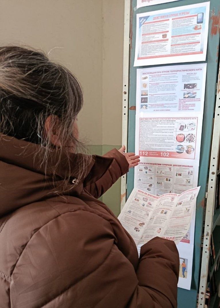 На информационной выставке, возле которой проходила беседа, размещены памятки о террористической угрозе. Посетители внимательно прослушали лекцию о правилах поведения и безопасности во время террористической атаки, а также что нужно делать, чтобы не стать жертвой террора.