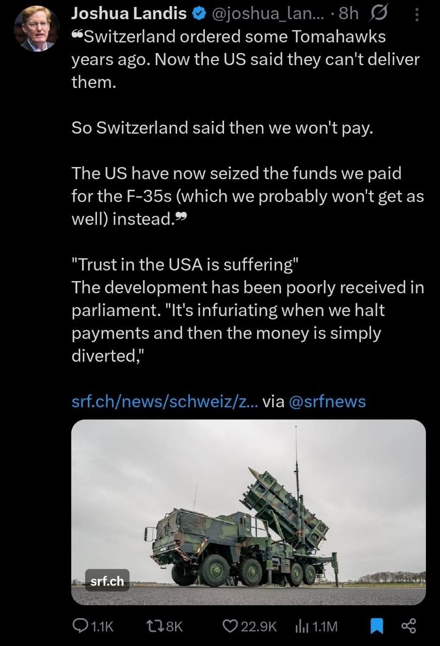 В ответ США, вместо выполнения обязательств, заморозили (фактически присвоили) средства, ранее перечисленные Швейцарией за истребители F-35, которые, по всей вероятности, также не будут поставлены.