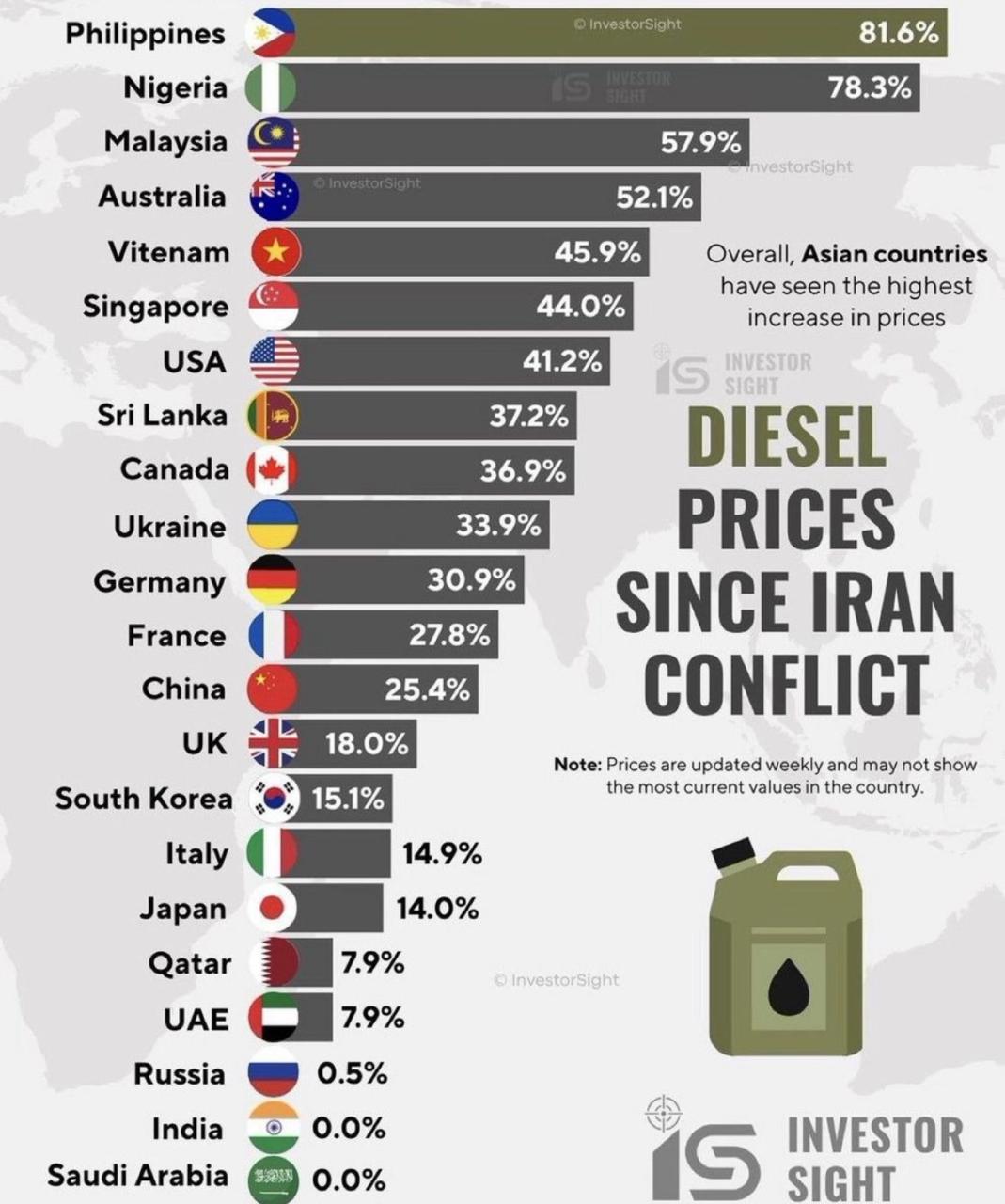 С начала конфликта дизель подорожал на Филиппинах на 81,6 %, в Нигерии — на 78,3 %, в Малайзии — на 57,9 %, в США — на 41,2 %, а в Германии — на 30,9 %