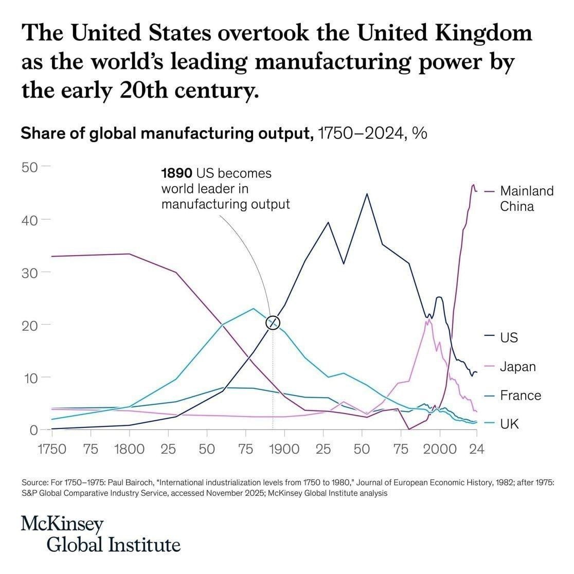 После Второй мировой войны на долю США приходилась почти половина мирового объёма промышленного производства, а теперь Китай превзошёл этот показатель.