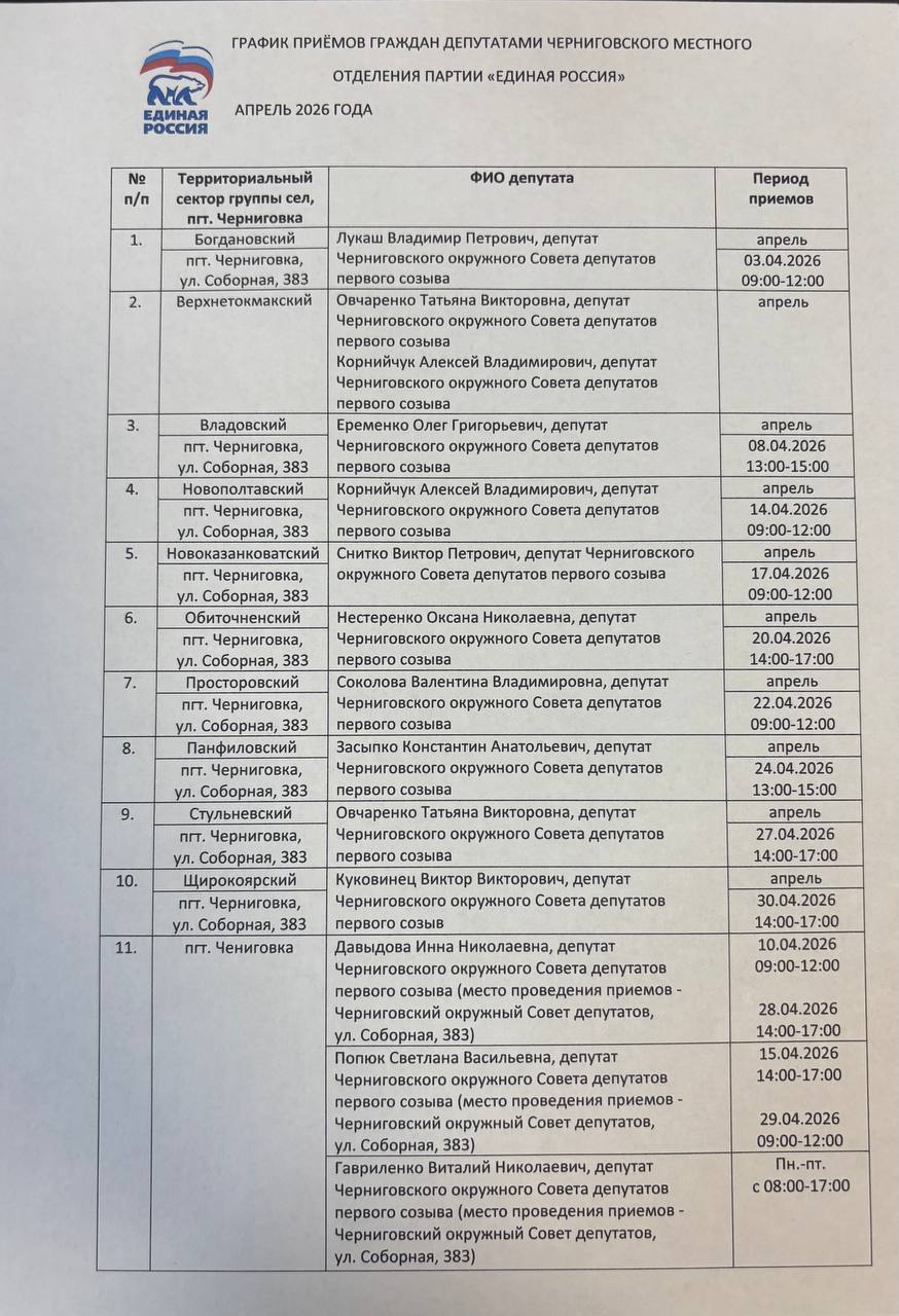 Черниговским местным отделением политической партии «Единая Россия» сформирован график приёма граждан на апрель 2026 г.