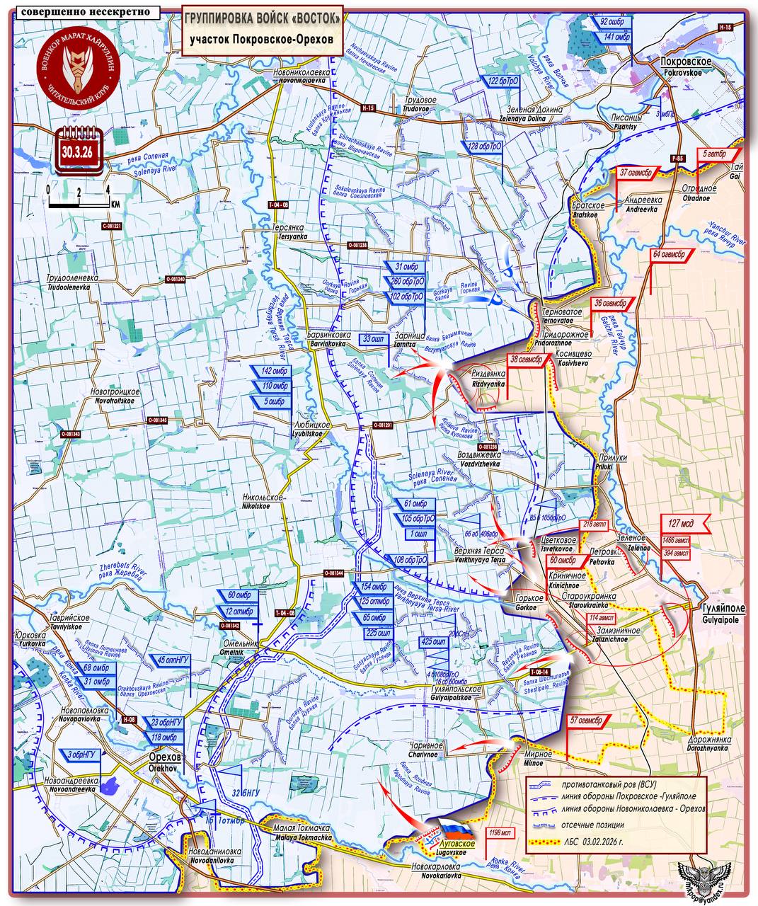 Поэтому, как только подсохнет грунт, выход российских штурмовиков вдоль балок Ягодная и Дурная, с контролем н.п. Чаривное,Червоная Криница и зачисткой лесополос станет необходимым условием обеспечения северо-восточного охвата района Орехов по трассе Т-08-14 Гуляйпольское - Омельник.