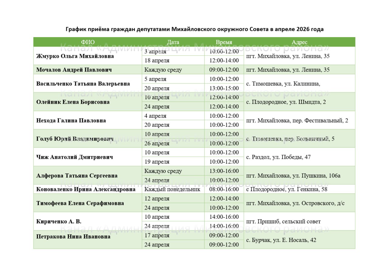 График приёма граждан депутатами Михайловского окружного Совета в апреле 2026 года