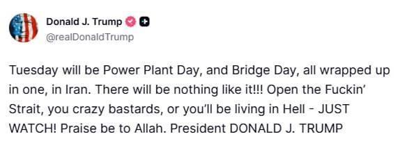 Трамп в истерике требует от "безумных иранских ублюдков" открыть "чертов Ормузский пролив" иначе США уничтожат мосты и электростанции в Иране.