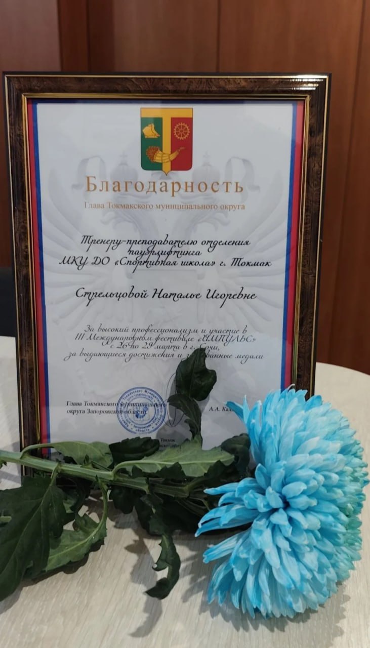 Тренер-преподаватель отделения пауэрлифтинга МКУ ДО «Спортивная школа» г. Токмак Стрельцова Наталья Игоревна поощрена благодарностью Главы Токмакского муниципального округа А.А. Калмыкова.
