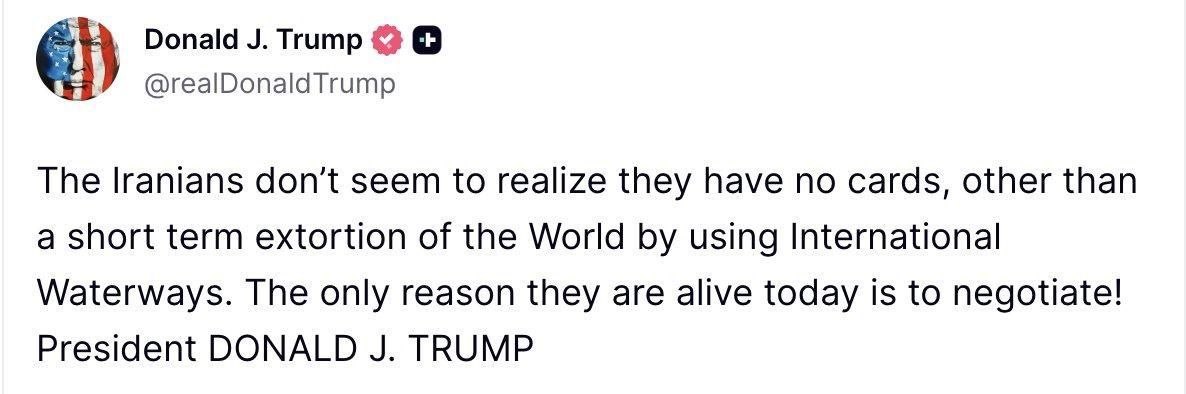 «Иранцы, похоже, не понимают, что у них нет никаких козырей, кроме краткосрочного вымогательства денег у всего мира с помощью международных водных путей. Единственная причина, по которой они сегодня живы, — это ведение переговоров!» Трумп снова собрался пугать Иран.