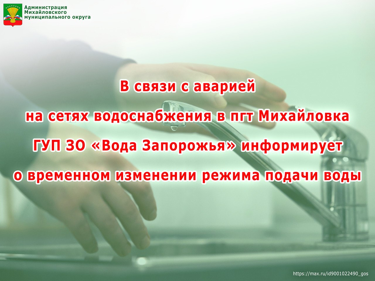 В связи с аварией на сетях водоснабжения в пгт Михайловка ГУП ЗО «Вода Запорожья» информирует жителей о временном изменении режима подачи воды