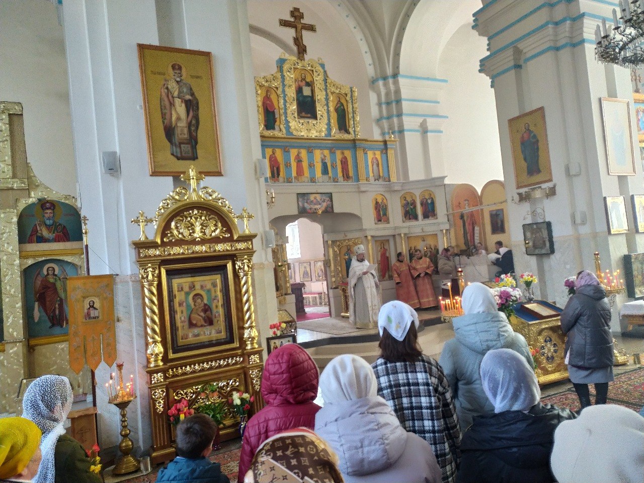 В светлое Христово Воскресение в Свято-Успенском соборе в Токмаке прошло торжественное пасхальное богослужение с ограниченным количеством прихожан