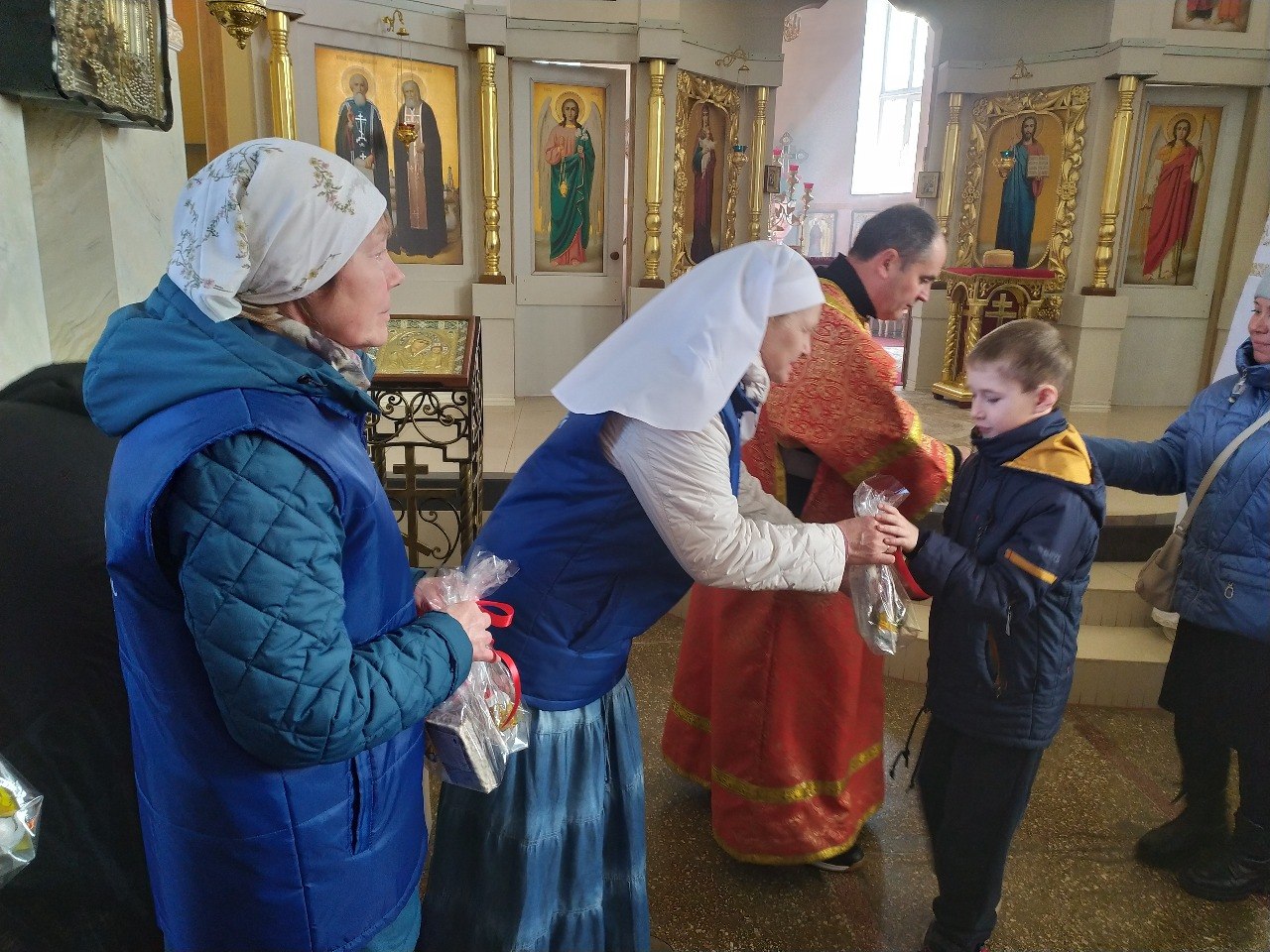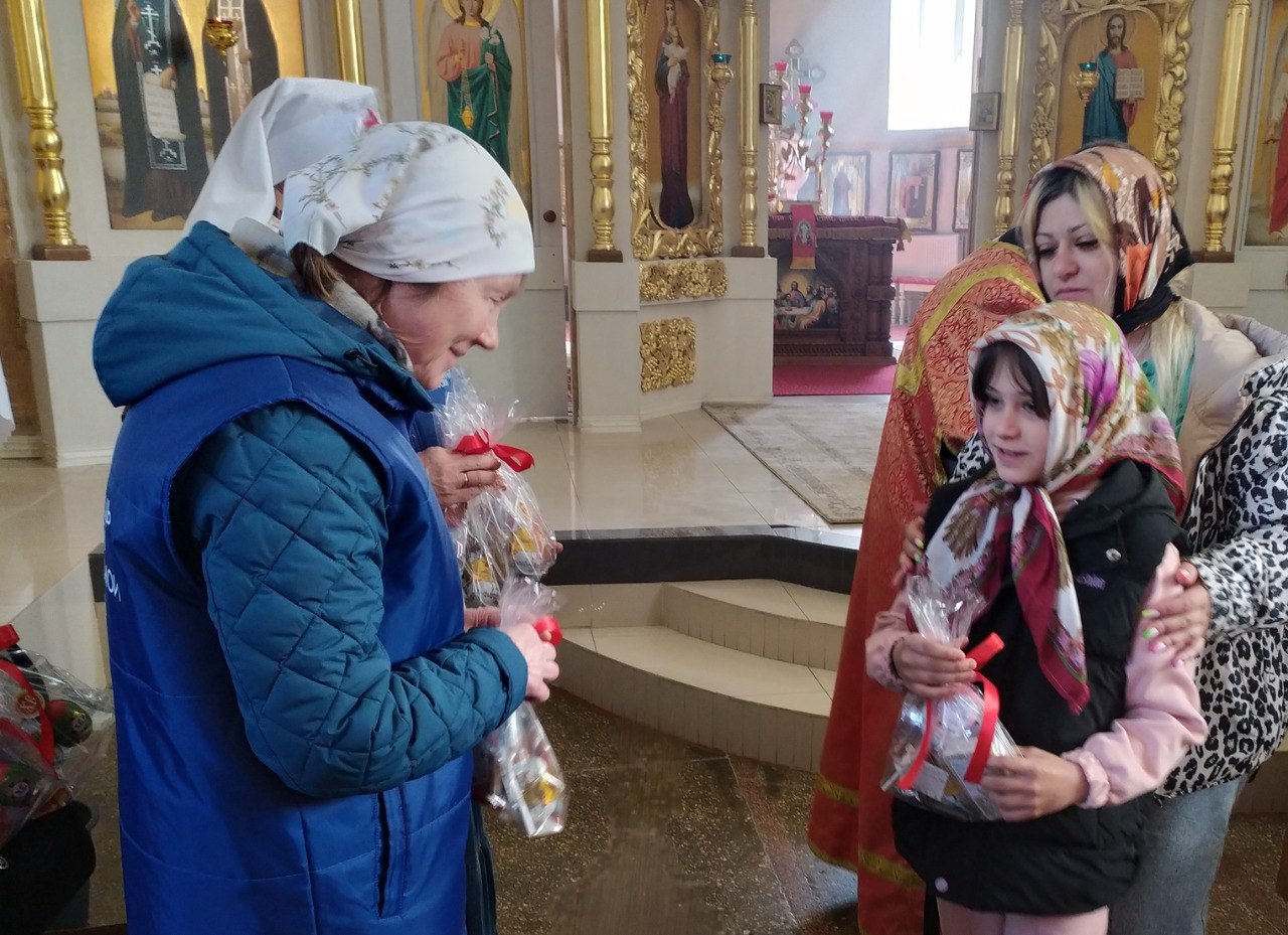 Добровольцы Патриаршей гуманитарной миссии к Светлому Христову Воскресению вручили подарки детям, присутствующим на праздничном богослужении.