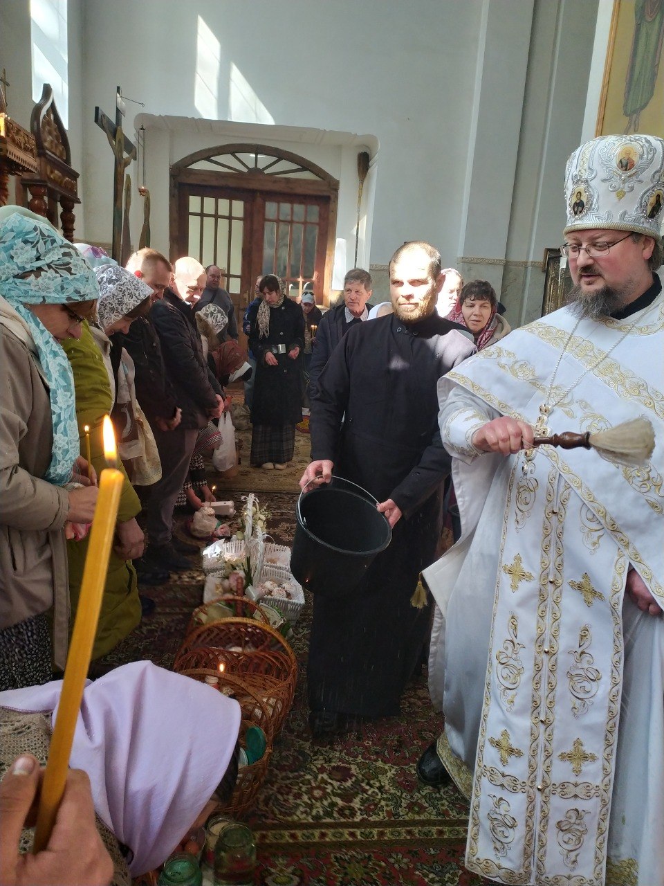 Под сводами храма под благую весть: «Христос воскрес!» отец Николай окропил святой водой токмачан и их Пасхальные корзины с куличами, пасхальными яйцами и разными вкусностями.