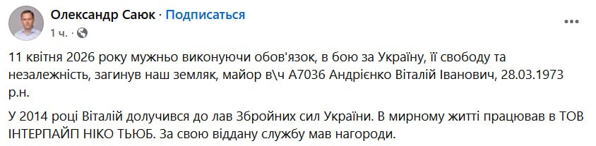 11 апреля 2026 года на Запорожском направлении ликвидирован офицер 108-й отдельной бригады территориальной обороны майор Андриенко Виталий Иванович.