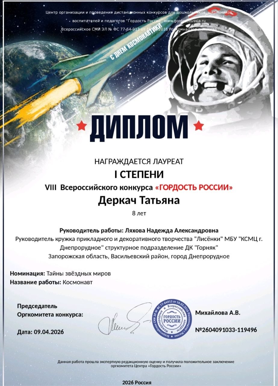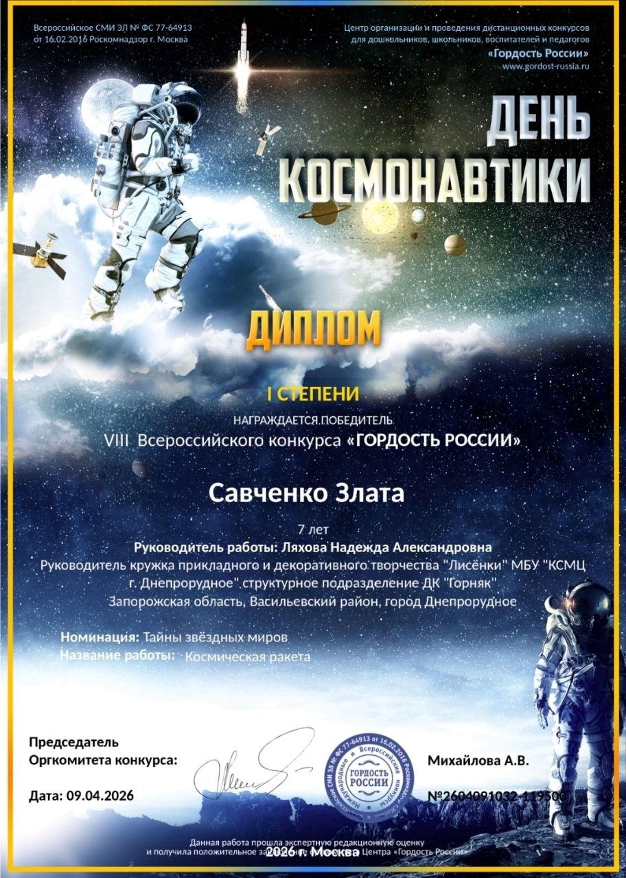 Наши юные творцы — Савченко Злата, Деркач Татьяна и Стременко Агата — одержали победу в VIII Всероссийском конкурсе "Гордость России" в номинации "Тайны звёздных миров" и получили Дипломы 1 степени!