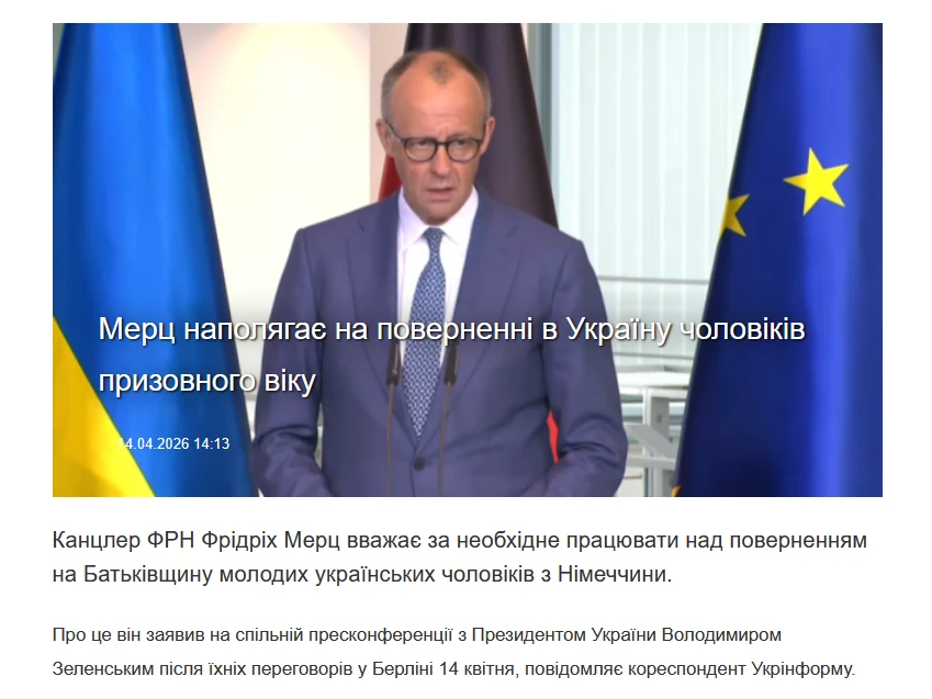 14 апреля 2026 года в Берлине на совместной пресс-конференции с Владимиром Зеленским канцлер Фридрих Мерц заявил: