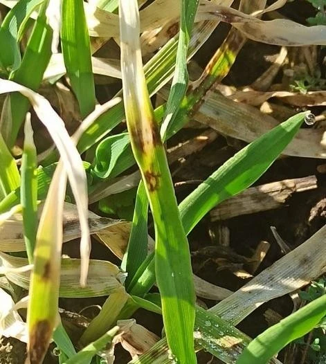 Развитие: Первичное заражение вызывают конидии и вегетативный мицелий гриба, сохраняющиеся на пожнивных остатках и сорных злаках. Болезнь распространяется с нижних листьев на верхние и их влагалища, особенно при наличии капельной влаги (росы). Возбудитель активен в широком диапазоне температур, при затяжных дождях и обильных росах. Заболевание особенно вредоносно при минимальной обработке почвы и посеве по стерне (накопление инфекции).