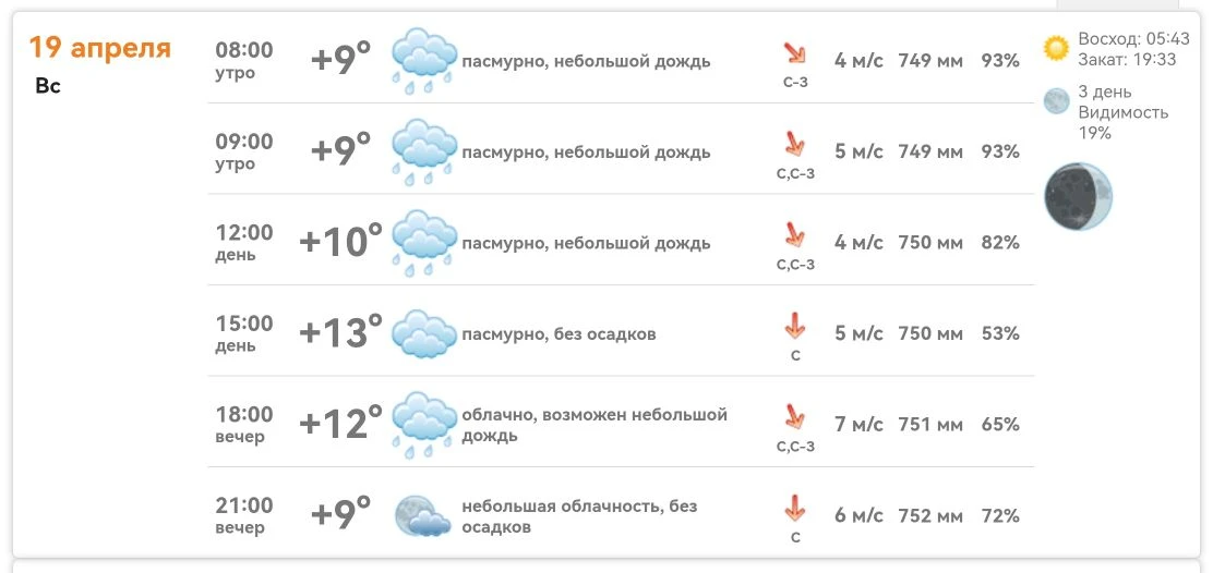 · Утро (+9°С): пасмурно, небольшой дождь, ветер 3–5 м/с.