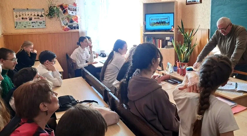 Председатель Совета ветеранов Сергей Быков рассказал учащимся о преступлениях нацистов, судьбах жителей оккупированных территорий и важности сохранения исторической правды. Особое внимание уделили личной ответственности каждого поколения за память о подвиге советского народа.