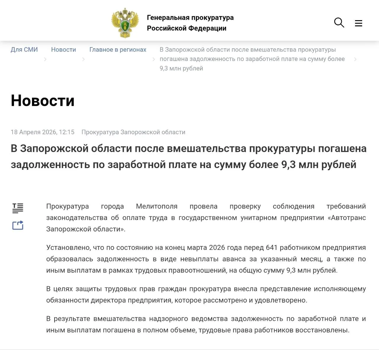По состоянию на конец марта 2026 года перед 641 работником ГУП «Автотранс Запорожской области образовалась задолженность на общую сумму 9,3 млн рублей.
