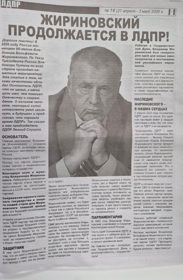 Дорогие земляки! В 2026 году Россия отмечает 80-летие Владимира Вольфовича Жириновского. По Указу Президента России Владимира Путина по всей стране проходят памятные мероприятия.