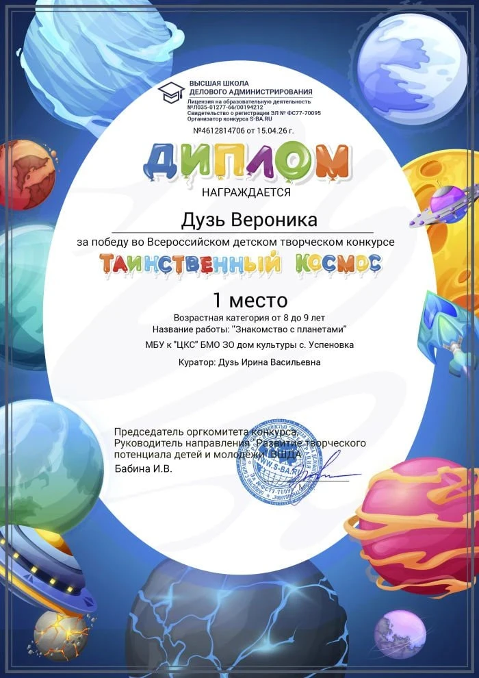 Дузь Вероника с работой «Знакомство с планетами»,
