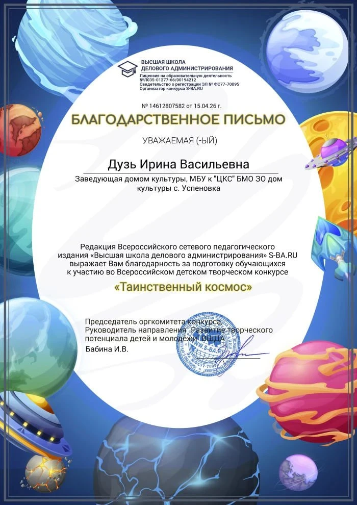 За высокую подготовку обучающихся к участию в конкурсе благодарственным письмом отмечена заведующая Домом культуры села Успеновка Дузь Ирина Васильевна.