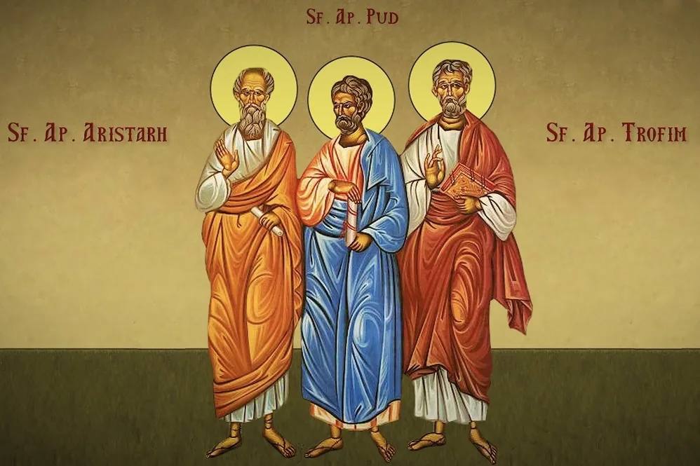 Святые апостолы Аристарх, Пуд и Трофим были из числа семидесяти апостолов, которых Господь Иисус Христос послал перед Собою с Евангельским благовестием. Святой апостол Аристарх, сподвижник святого апостола Павла, стал епископом сирийского города Апамеи. Имя его неоднократно упоминается в книге Деяний святых апостолов и в Посланиях апостола Павла. Святой апостол Пуд упоминается во 2-м Послании апостола Павла к Тимофею. Он занимал высокое положение члена римского Сената. В своём доме святой принимал первоверховных апостолов, собирал верующих христиан. Дом его был обращён в церковь, получившую название «Пастырской». В ней, по преданию, священнодействовал сам святой апостол Петр.