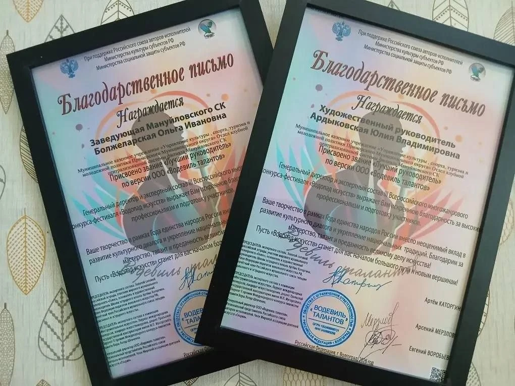 Благодарственные письма от организаторов получили художественный руководитель Юлия Ардыковская и заведующая Мануйловским СК Ольга Болжеларская.