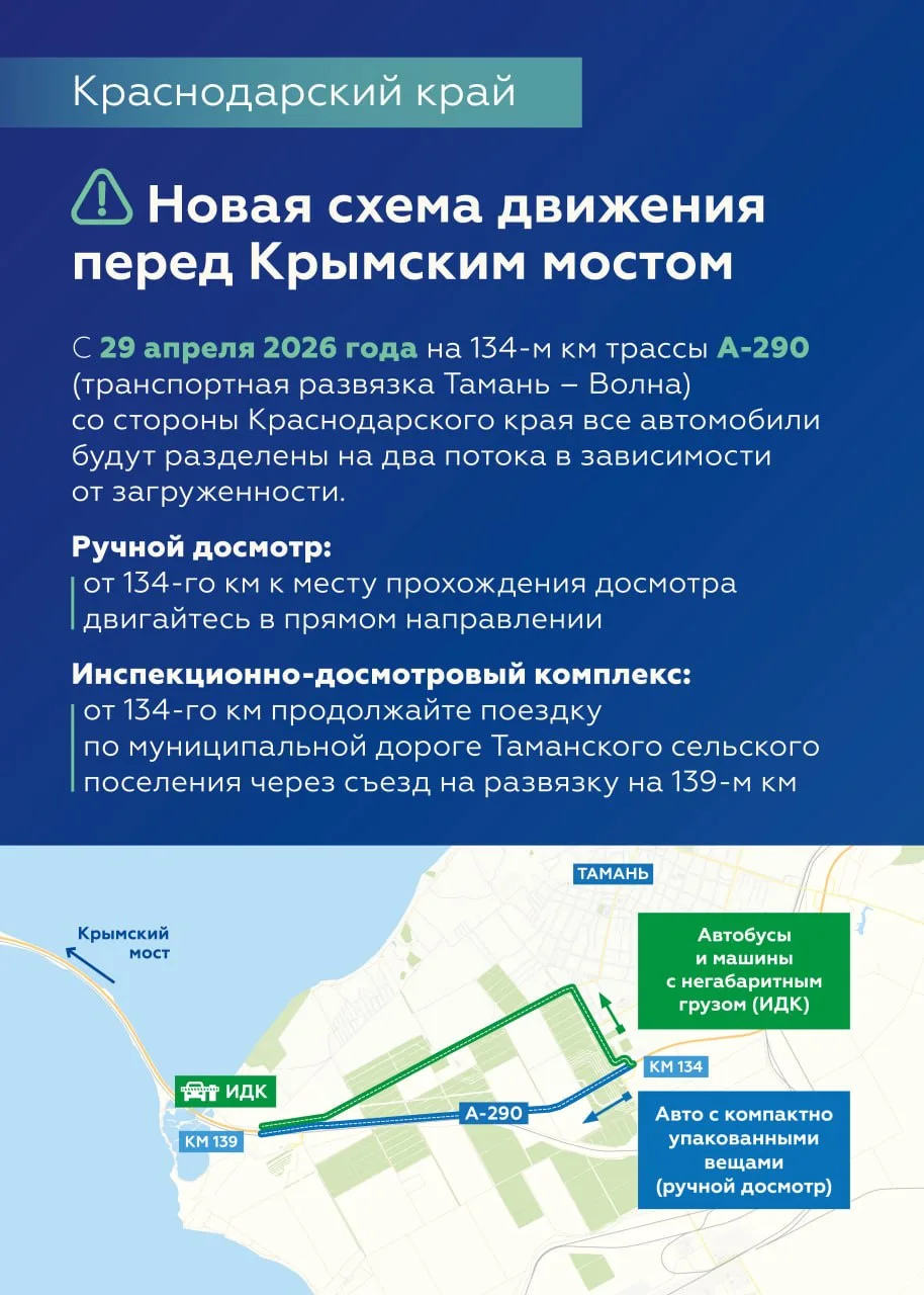 • Транспорт с негабаритным грузом, а также пассажирские автобусы направят на муниципальные дороги Таманского сельского поселения через съезд на 139-м км для дальнейшего прохождения аппаратного досмотра