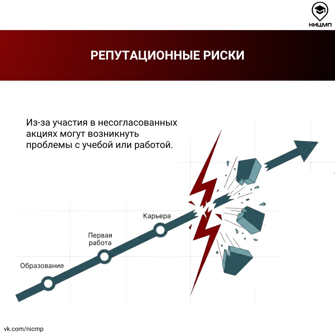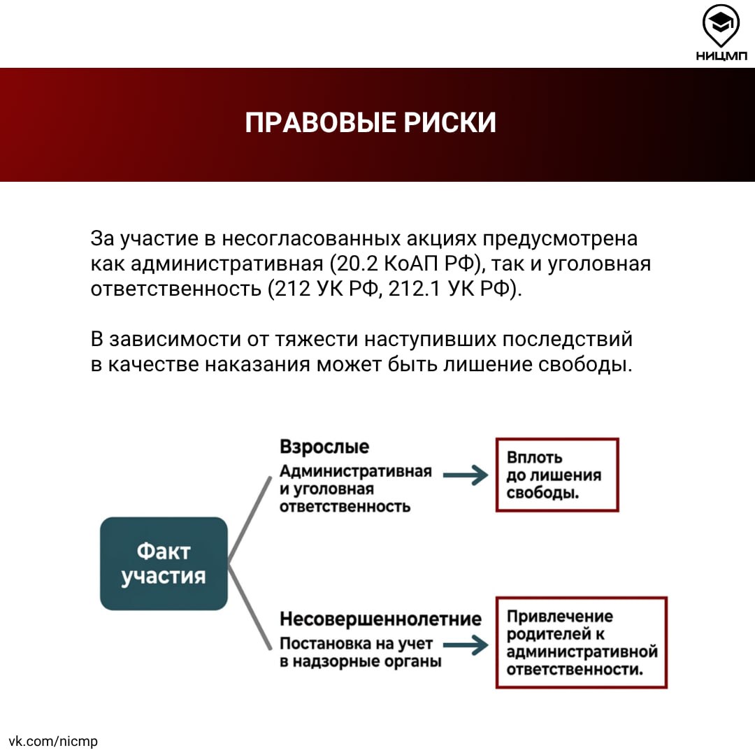Участие в таком мероприятии влечет административную или уголовную ответственность. Для несовершеннолетних — постановку на профилактический учет в органах внутренних дел, что в будущем ограничивает поступление в вузы и трудоустройство. Родители могут быть привлечены за ненадлежащее воспитание, а вовлечение подростков в подобные акции квалифицируется как уголовное преступление.