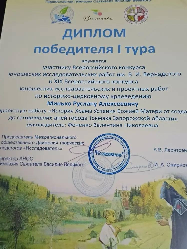 Под руководством учителя - методиста Валентины Николаевны Фененко Руслан разработал проект по теме «История Храма Успения Божией Матери от создания до сегодняшних дней города Токмака Запорожской области».