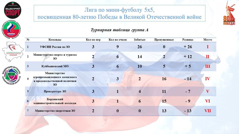 Следите за новостями первой в Запорожской области Лиги по мини-футболу 5х5, посвященной 80-летию Победы в Великой Отечественной войне, впереди еще множество интересных и захватывающих матчей.